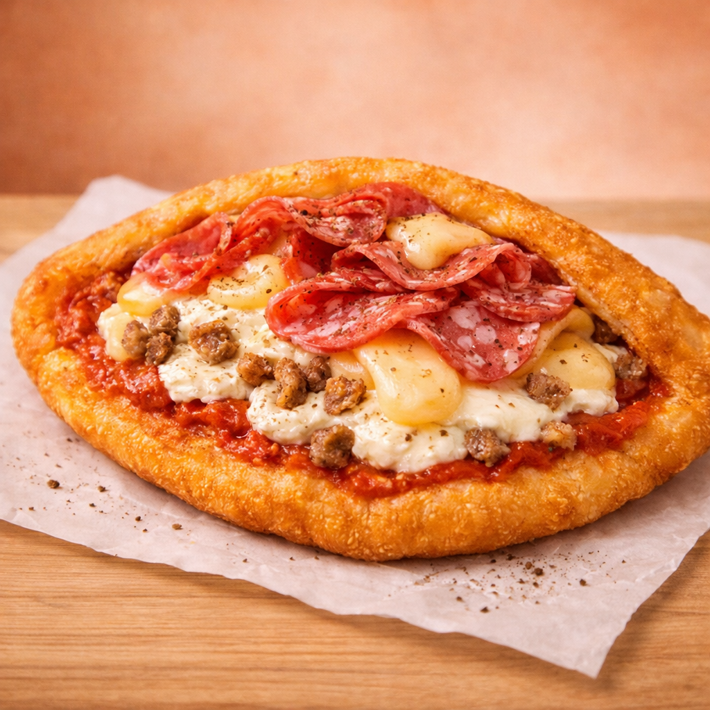 Pomodoro, ricotta, cicoli, salame napoletano dolce, provola affumicata, pepe.