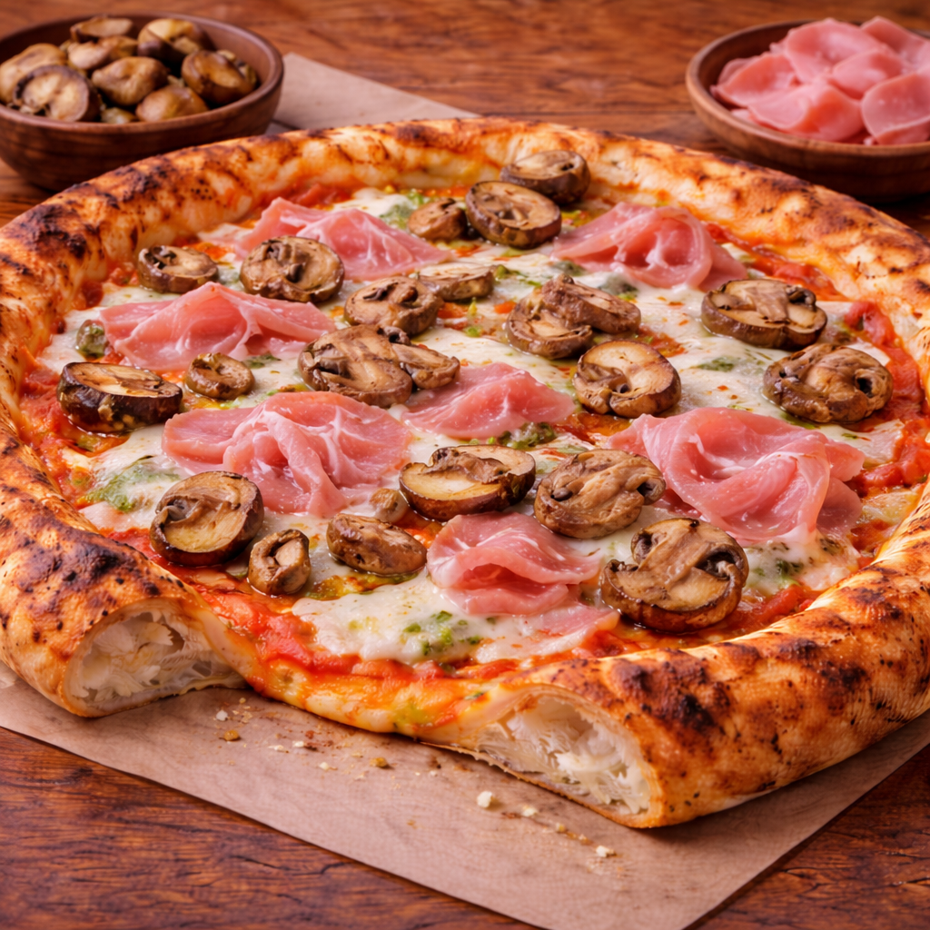 Pomodoro, fior di latte, gorgonzola, prosciutto cotto, funghi