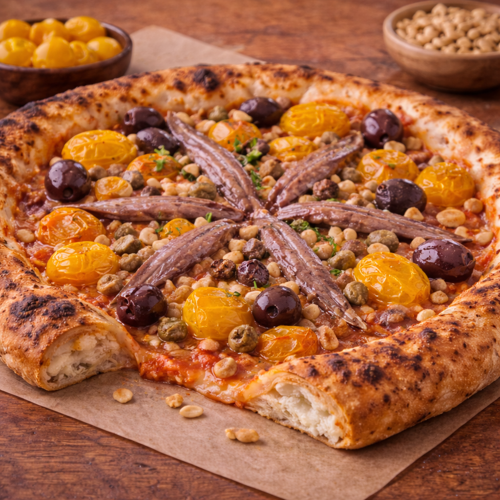Pomodoro giallo, capperi, acciughe, olive, pinoli