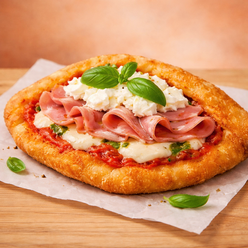 Pomodoro, fior di latte, ricotta, prosc. cotto, olio, basilico